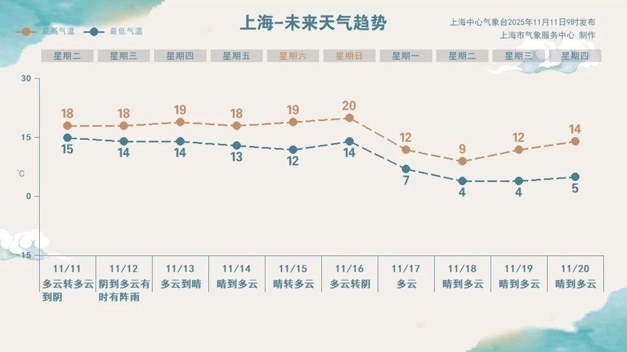 一方面,台风不消停,另一方面,冷空气活跃。本周的冷空气也是一股接着一股。未来7天还将有两股冷空气影响我国,总体先弱后强。第一股冷空气主要影响北方,这股弱冷空气将从新疆开始自西向东影响黄淮以北大部地区,但由于实力较弱,影响时间短暂。第二股冷空气将影响全国大部地区,预计14日到17日,这股较强冷空气将自西向东自北向南影响我国,中东部大部地区先后降温4至8℃,华北西部、内蒙古东部和东北部分地区降温10至12℃;长江中下游及其以北大部地区有4至6级偏北风、阵风7至8级。这股冷空气降温实力不容小觑,将使得北方大部到江南多地气温纷纷创立秋后新低,冷暖形势或将逆转。届时,上海的气温也会再下一个台阶。