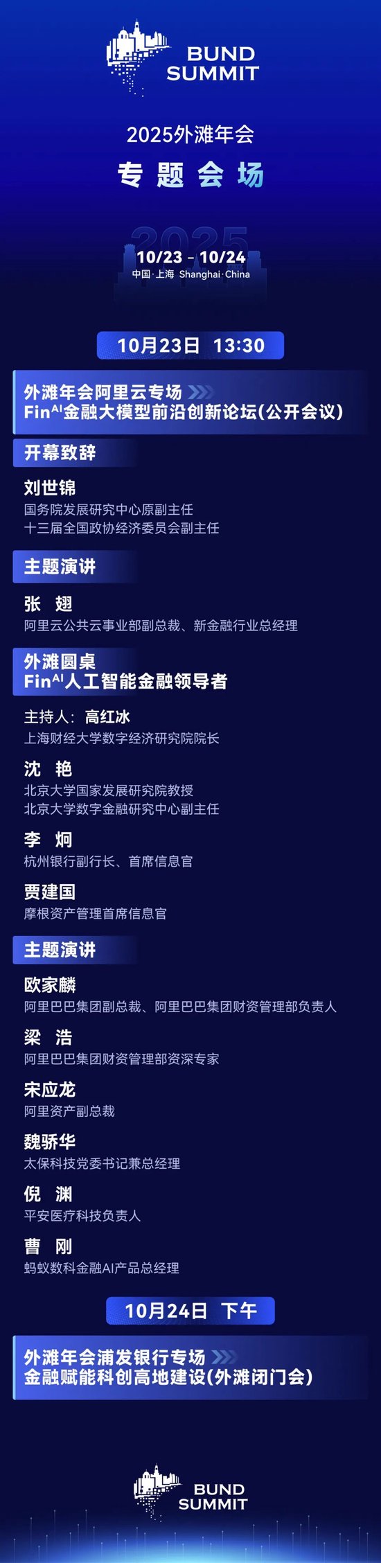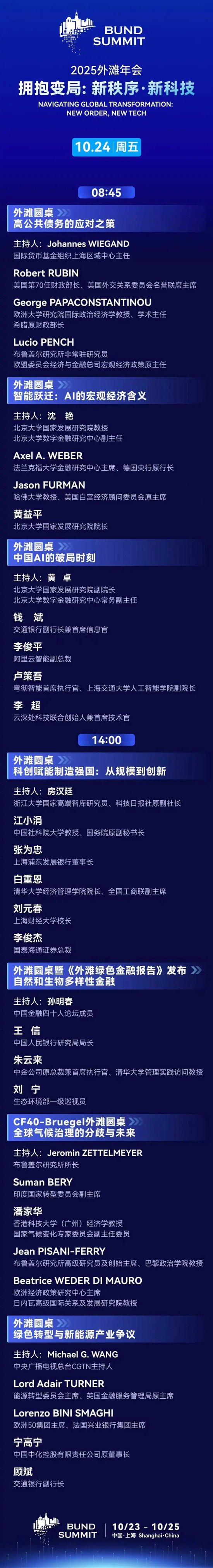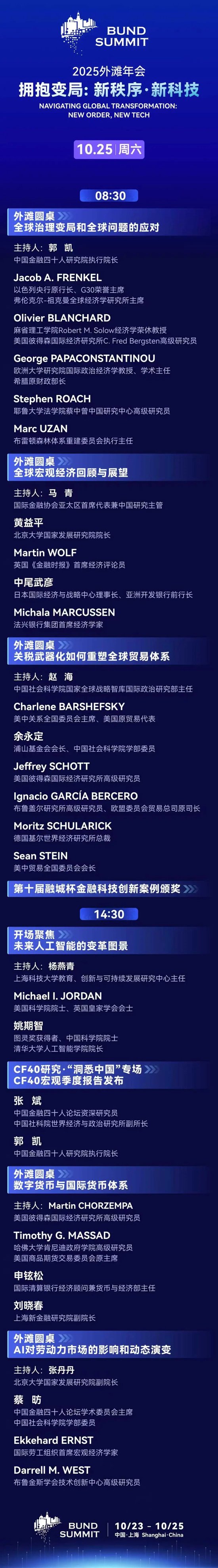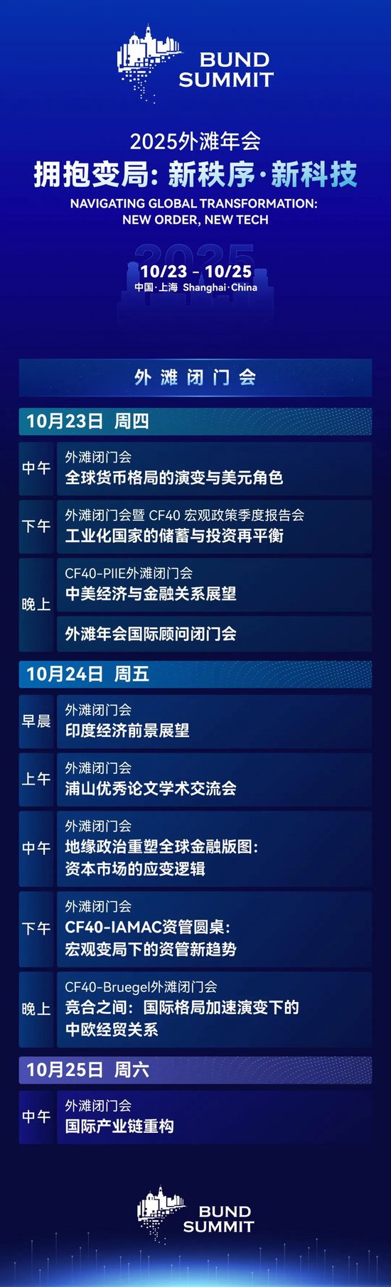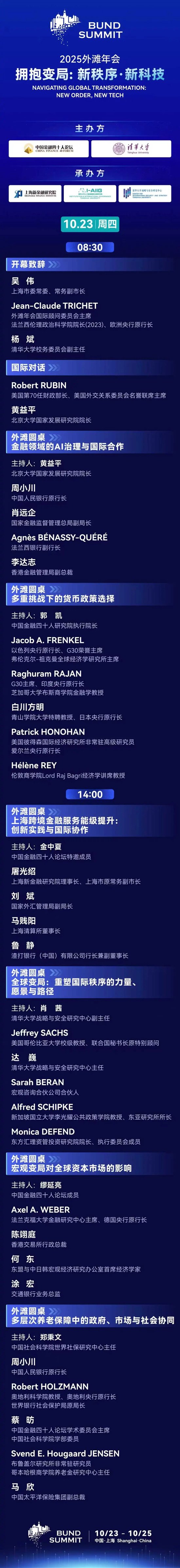 10月23-25日,2025外滩年会“拥抱变局:新秩序·新科技”将在上海市黄浦区召开。本届年会由中国金融四十人论坛(CF40)与清华大学(THU)联合主办。